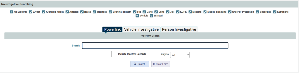 PowerLink is a powerful free-text search tool that enables operators to search every word, field, and record across the REJIS criminal justice database using simple, intuitive search terms. Designed with an internet-style approach, PowerLink provides immediate results, delivers hyperlinks to full records, and includes tools for expanded person and vehicle searches.